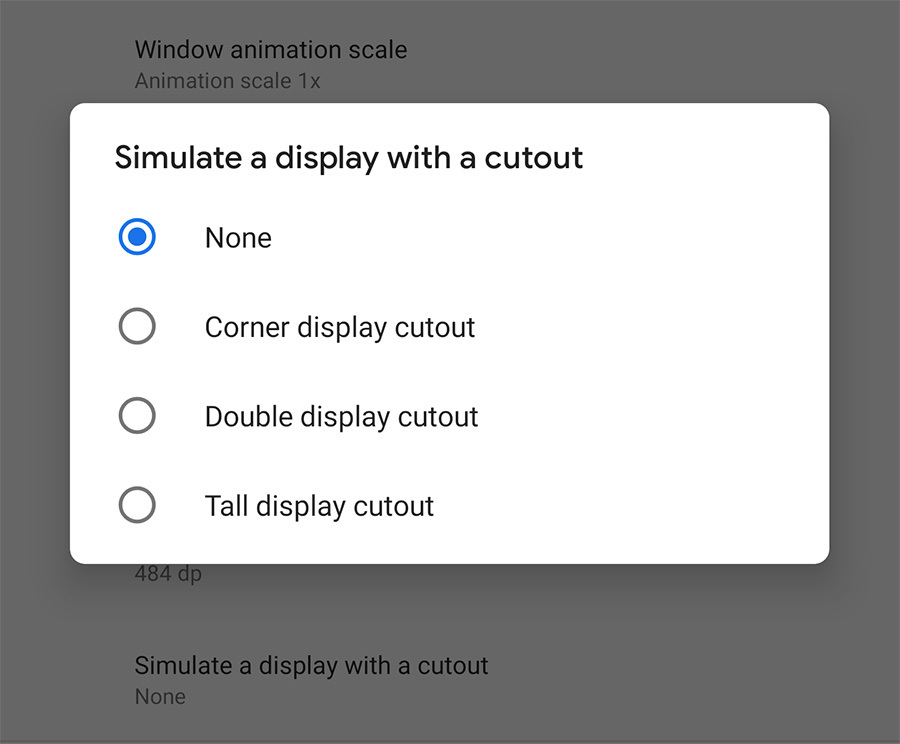 Android P 개발자 옵션 > Drawing > Simulate a display with a cutout에서 옵션 4 가지를 활성화해볼 수 있다.