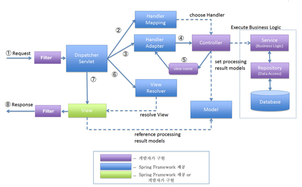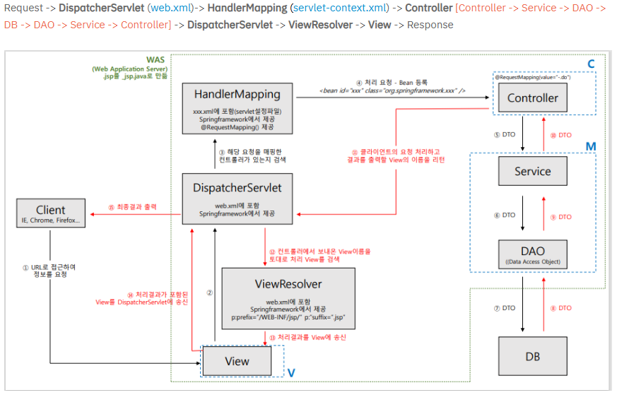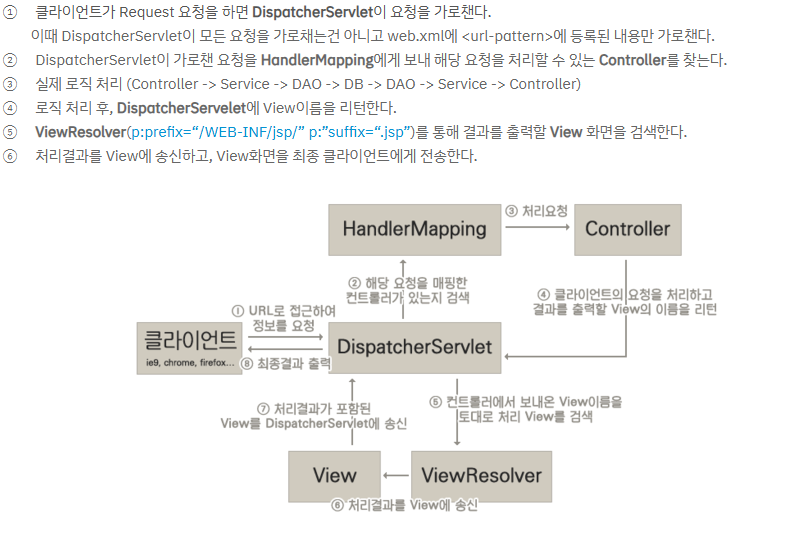 1. 스프링 MVC 프로젝트의 기본 구조 2. 스프링 프레임워크의 전체 동작 순서 Request -> DispatcherServlet (web.xml)-> HandlerMapping (servlet-context.xml) -> Controller [Controller -> Service -> DAO -> DB -> DAO -> Service -> Control