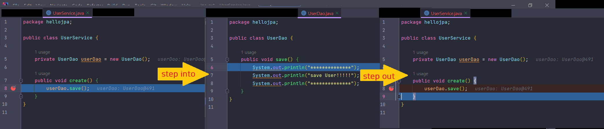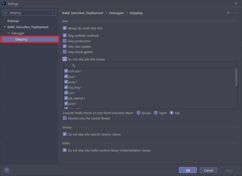 - stepping์ ์ค์ ๋ ํด๋์ค/๋ฉ์๋ ๊ณผ์ ์ ์คํตํ์ง ์๊ณ ํ์ฌ break๋ ๋ผ์ธ์์ ์คํ ์ค์ธ ๋ผ์ธ์ผ๋ก ์ด๋