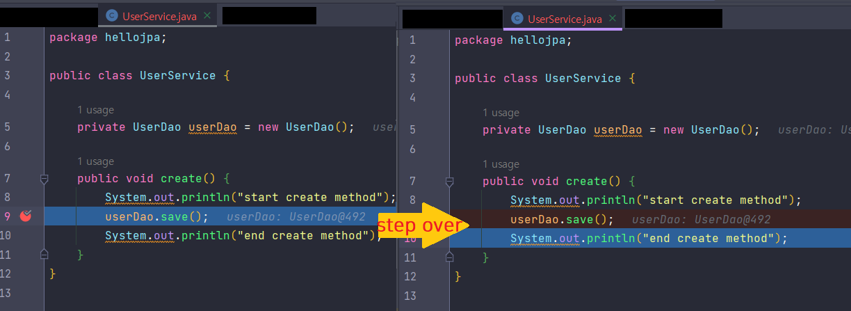 - ex) UserService์ userDao.save() ๋ผ์ธ