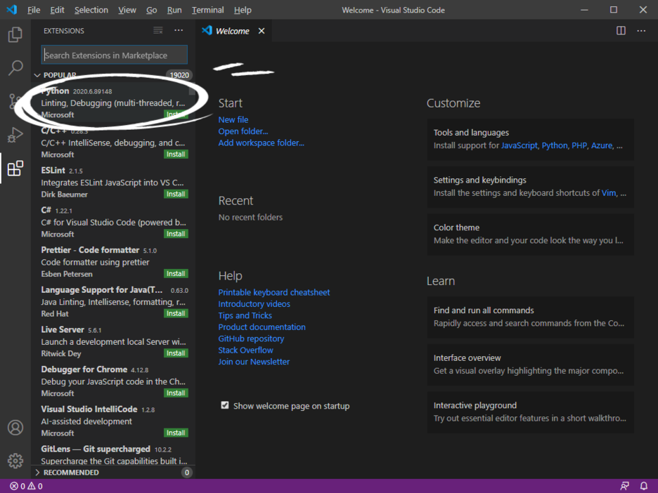 Python옆에 조그마하게 보이는 Install을 눌러서 Python Extension 설치!