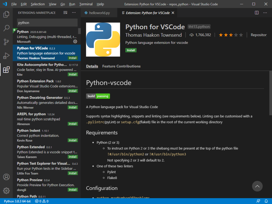 그리고 Visual Studio Code에서 Python을 쓸려고 하면 extension 중에 Python for VSCode를 설치하면 편하다고 하니 (앞에서 본 pylint가 포함되어 있다) 꼭 설치해서 쓰길 바란다.
