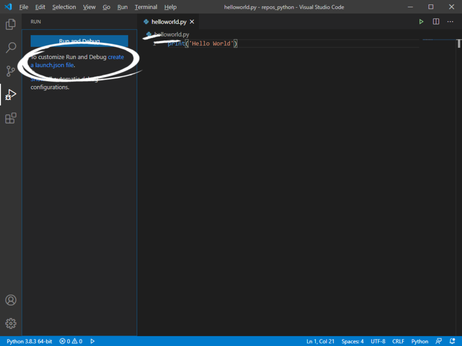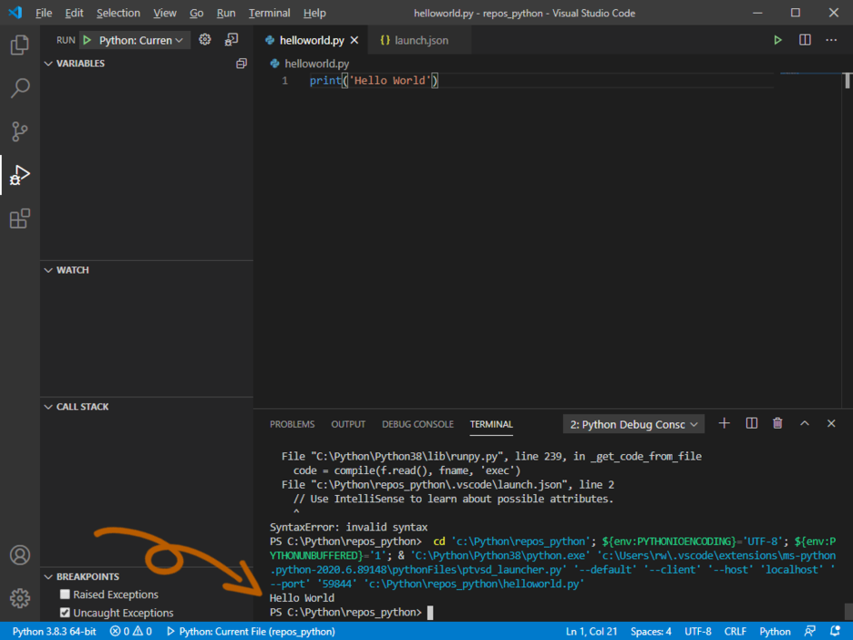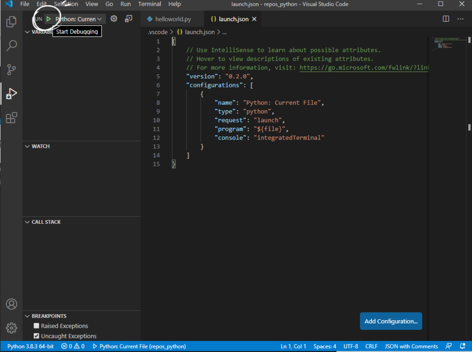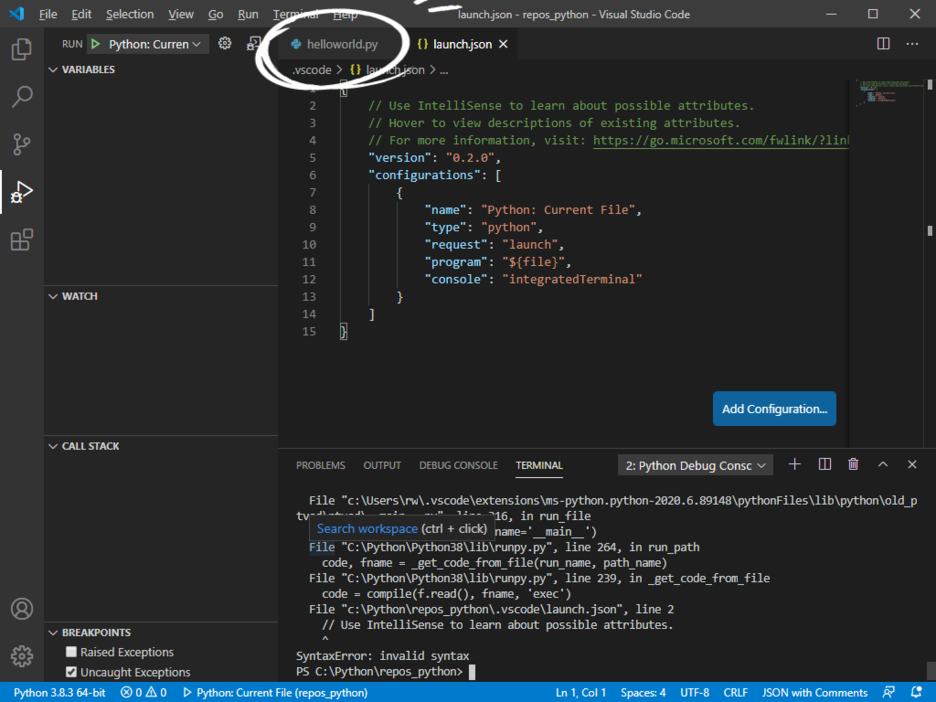 이건 아주 간단한 이유로 안되는 건데, 우리가 실행할 파일이 launch.json이 아니라 helloworld.py이기 때문이다.