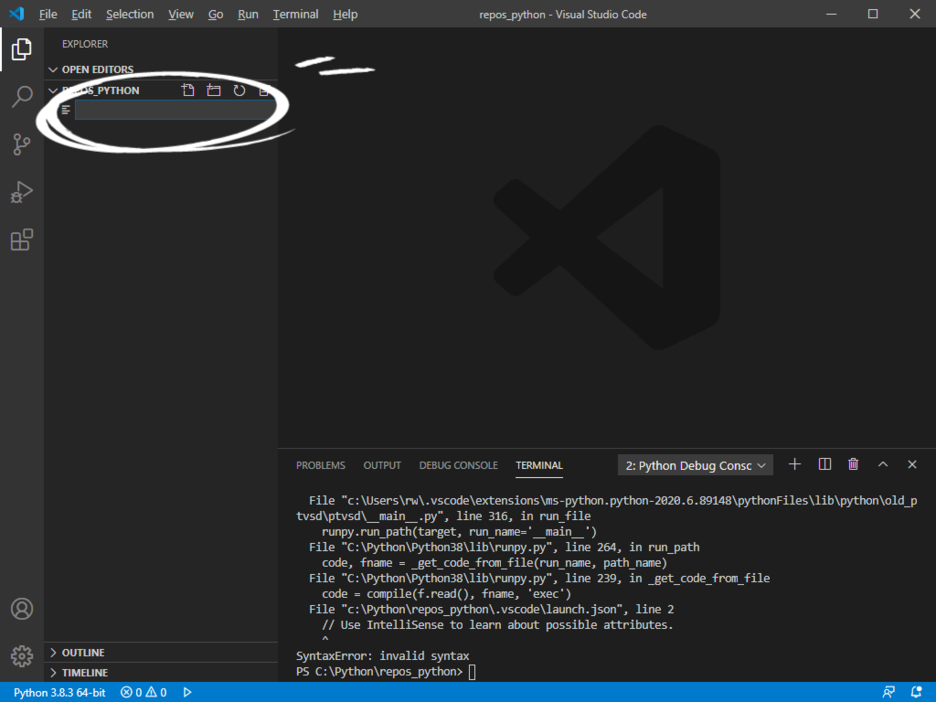 해보면 오류가 뜬다. (TERMINAL에 보면 SyntaxError: invalid syntax 라고 떠있다.)