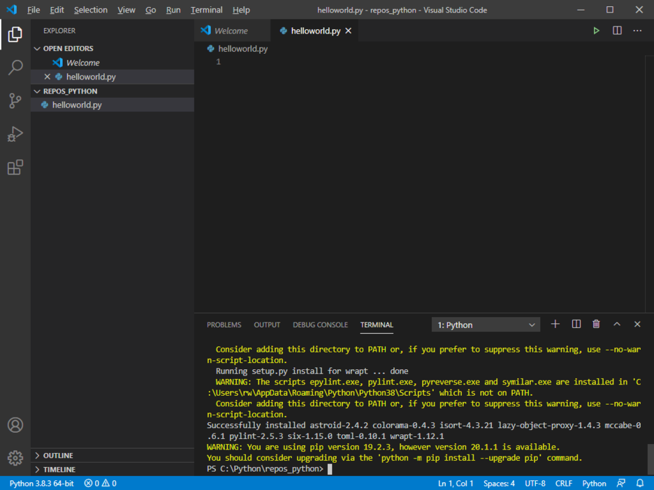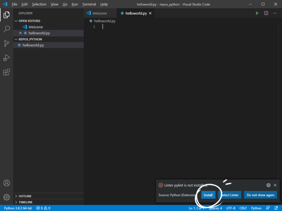 오른쪽 아래에 보면 여러 메세지가 뜰 텐데, 그 중에 Linter pylint is not installed. 라는 메세지가 뜬다면 Install을 눌러 주면 좋다. (정적분석 도구라고 디버깅을 하지 않고 코드 오류를 찾아준다.)