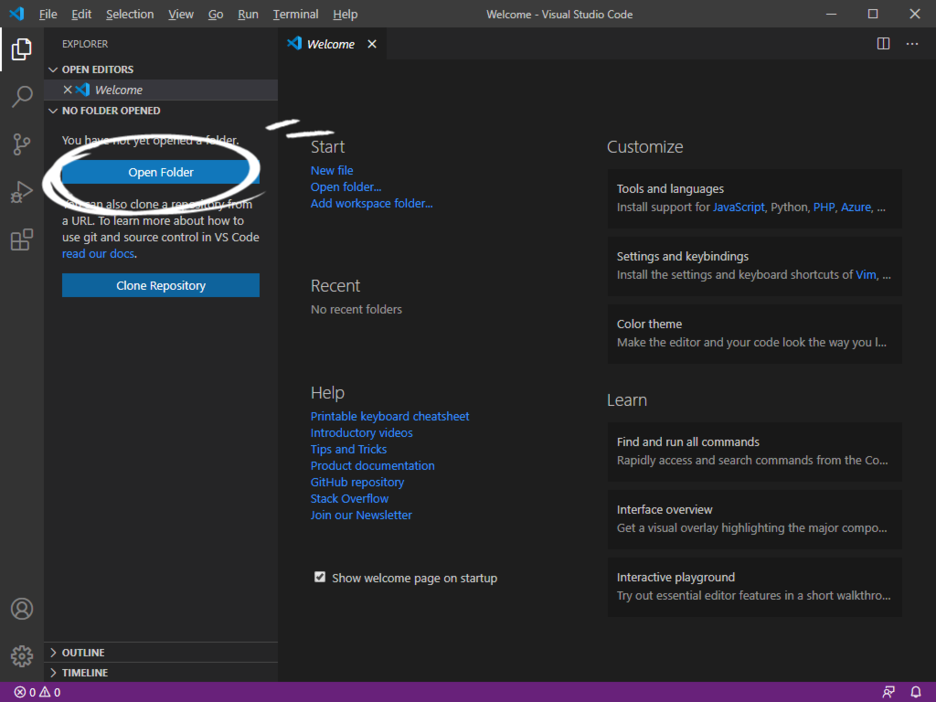 Open Folder를 눌러 새로 만든 폴더를 선택해준다.