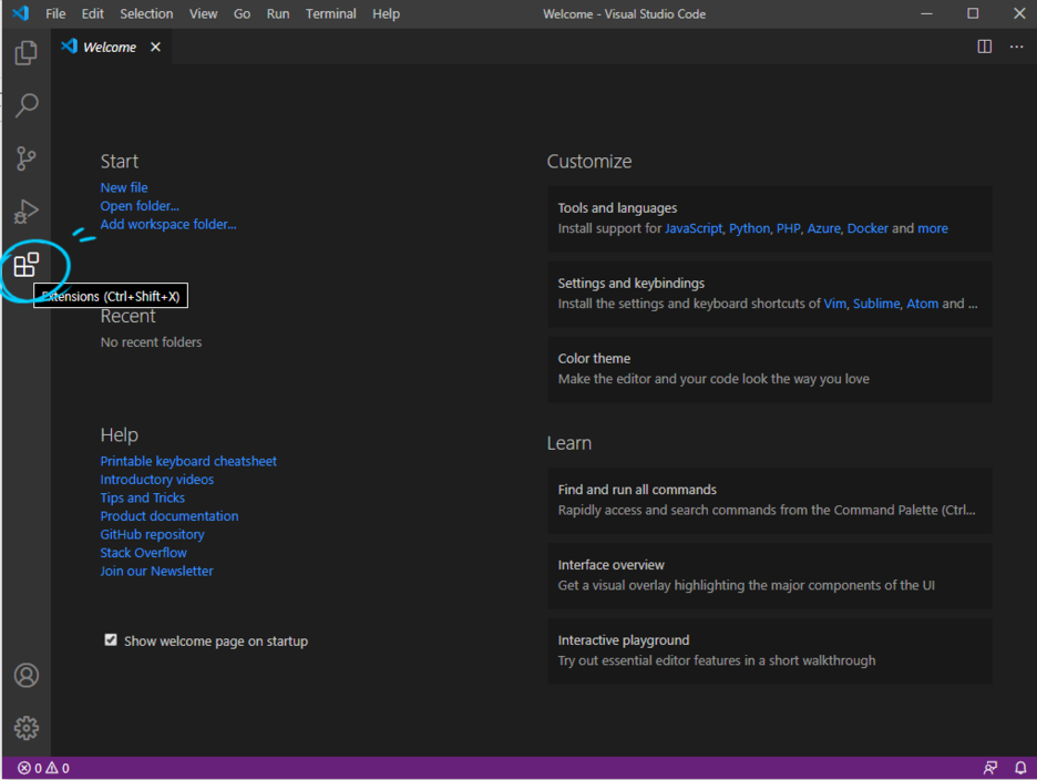 Visual Studio Code를 실행하고 왼쪽에 Extensions을 누름.