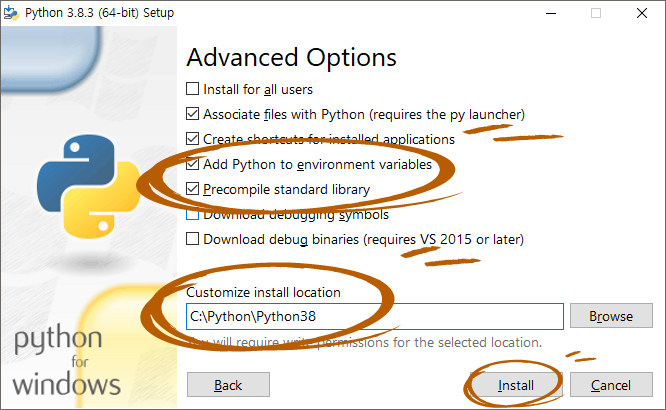 Add Python to environment variables 과 Precompile standard library는 추가로 체크해 주자. 그리고 Customize install location (설치폴더)가 길게 적혀 있을텐데 찾기 쉽게 바꾸는 것을 추천!