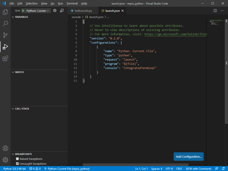 그림 아래 그림 처럼 launch.json 파일 생성된 것을 알수있다. 나중에 필요하다면 Add Configuation을 통해 코드를 추가 할 수 있다.
