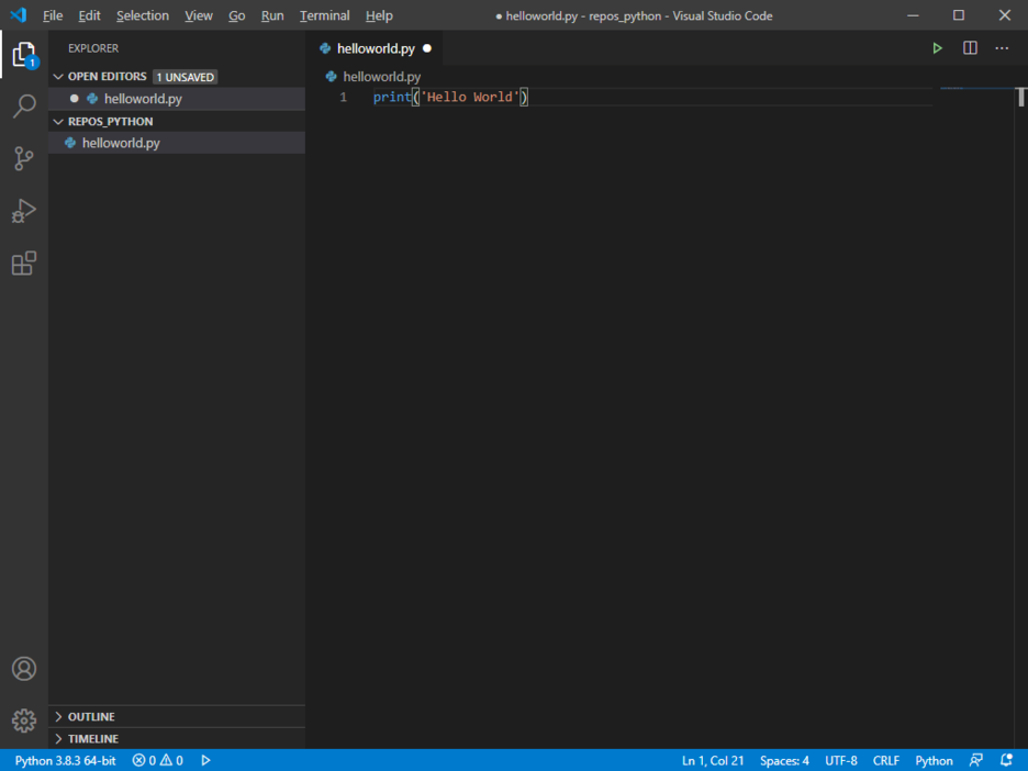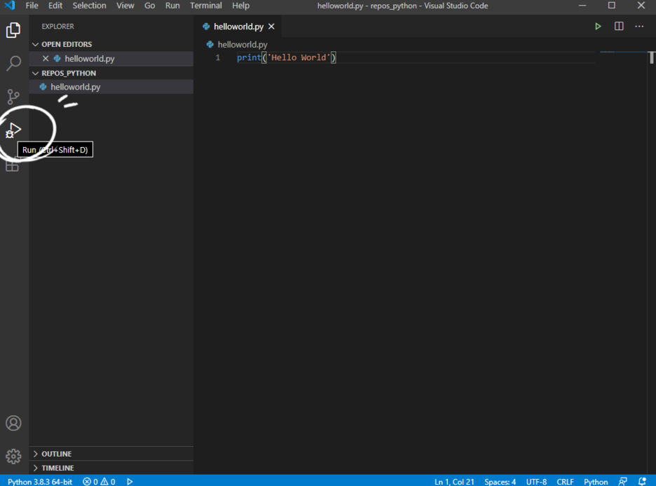 가장 간단한 코드인 print("Hello World")를 입력하자.