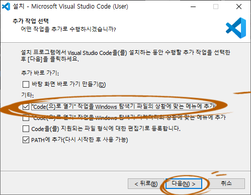 설치 중에 "Code(으)로 열기" 작업을 Windows 탐색기 파일의 상황에 맞는 메뉴에 추가 항목이 있는데,
