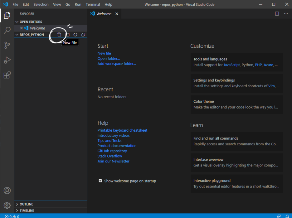 New file을 누르고, 원하는 파일명을 입력한다. 지금은 "helloworld.py" 파일을 만듬.