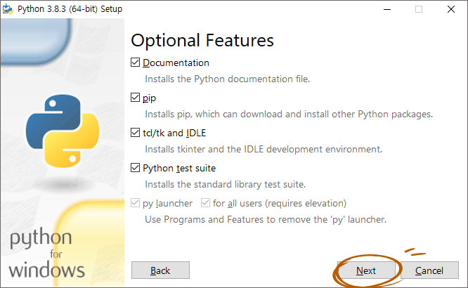Add Python 3.8 to PATH: cmd 창에서 어느 폴더에서 든지 파이썬 명령어를 실행하게 해줌 (환경 변수 추가)