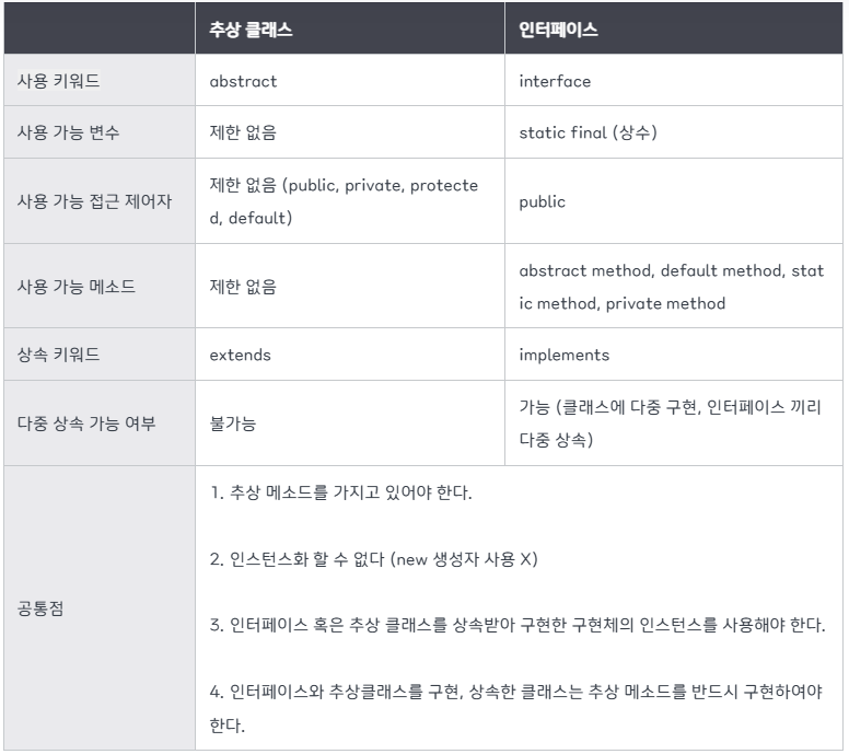 - 클래스와 별도로 구현 객체가 같은 동작을 한다는 것을 보장하기 위해서 사용하는 것이 초첨.